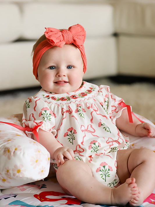 Spring Floral Smocking Embroidery Bow Baby Girls Romper