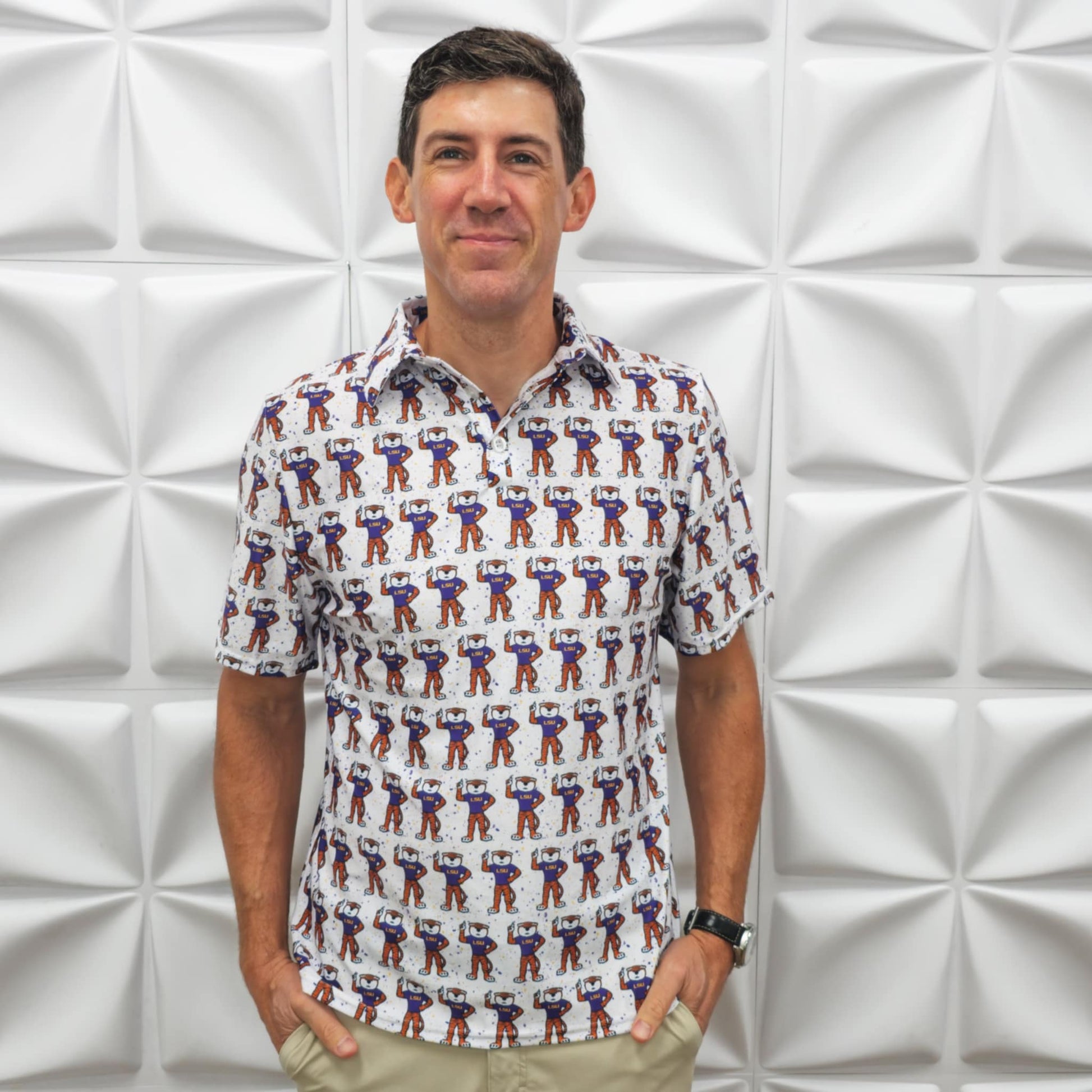 Turn heads and show out in this fun, officially licensed LSU polo featuring an all-over print of Mike the Tiger living his best game day life! This shirt brings the perfect mix of personality and pride β ideal for tailgates, watch parties, and everything in between. π―π