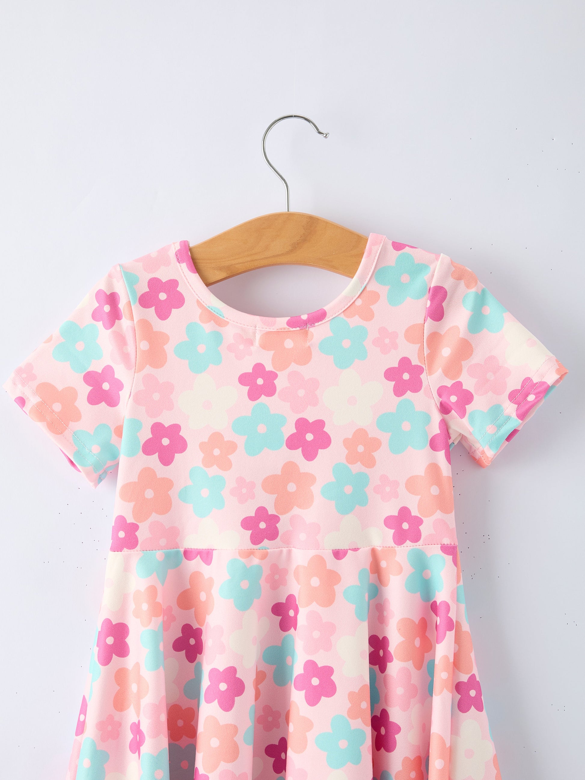 Brighten her wardrobe with this vibrant floral short sleeve dress, perfect for warm weather adventures and special occasions. Featuring a cheerful mix of colorful blooms on soft, breathable fabric, it's designed for all-day comfort and easy movement. The classic short sleeve silhouette keeps her cool while the playful print captures that carefree spirit of childhood. Ideal for playdates, family gatherings, or everyday wear that makes getting dressed fun.