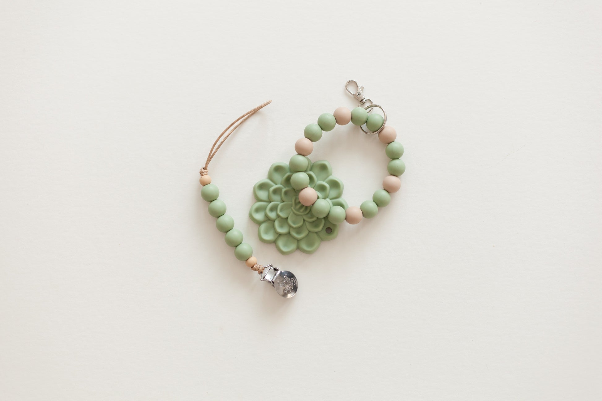 This bundle includes a Golden Baby signature Sage Succulent Teether for baby with an accenting Sage Succulent Wristlet for Mom and an Sage Succulent Keychain for the diaper bag!