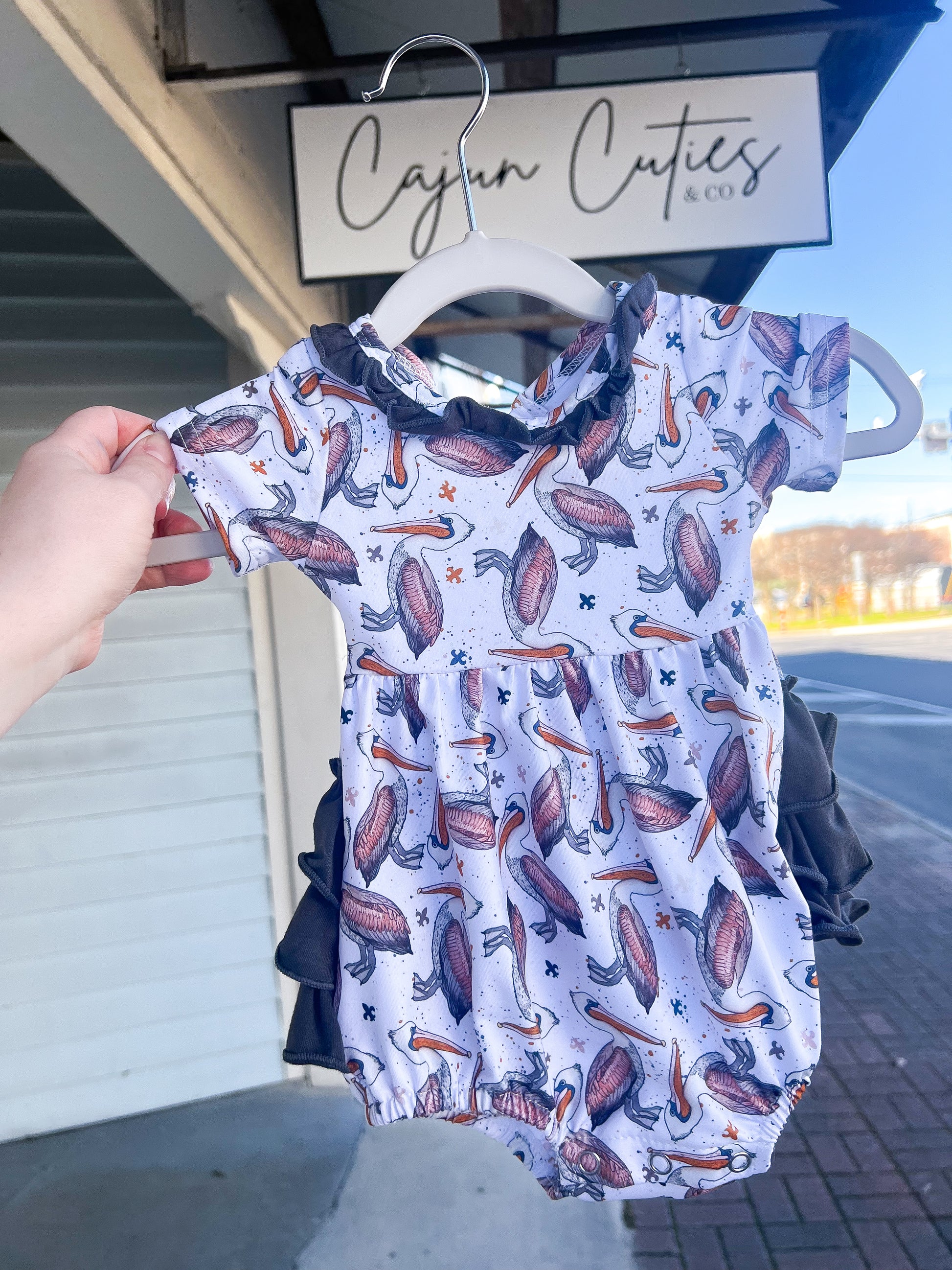 Celebrate the spirit of New Orleans sports with our Big Easy Sports Fan Bubble This unique outfit merges the iconic symbols of the New Orleans Saints and the New Orleans Pelicans into one festive piece, perfect for your little sports enthusiast. Featuring design elements from both teams, such as the Saints' fleur-de-lis and the Pelicans' vibrant colors, this Jon Jon is a touchdown and slam dunk for any game day gathering or sports-themed event. Child's New Orleans Saints and Pelicans themed Bubble combining team colors and logos, perfect for young sports fans