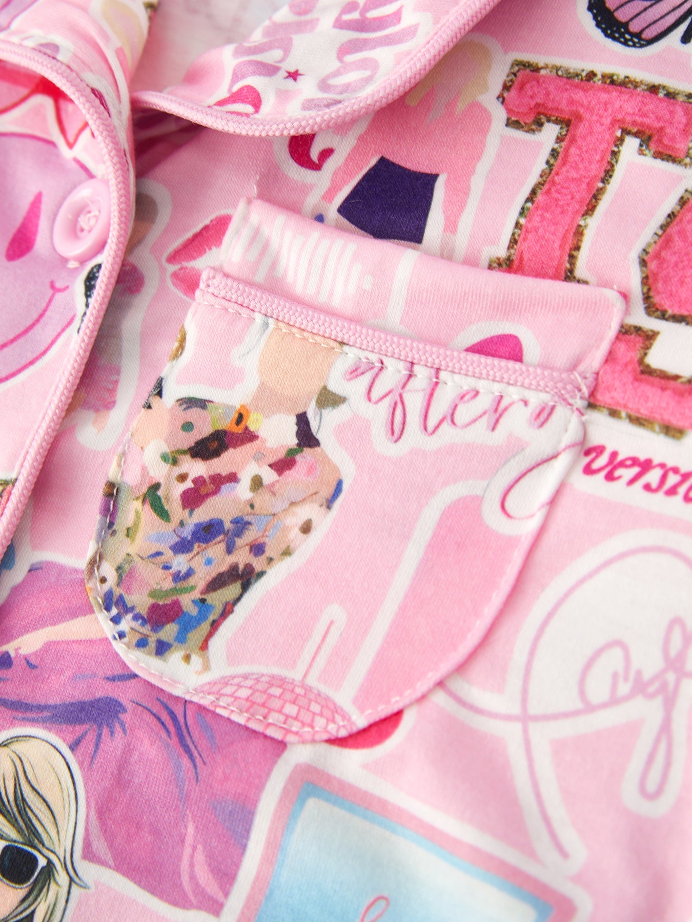 Pink TS Lapel Button Short Sleeve Shorts Pajama Set