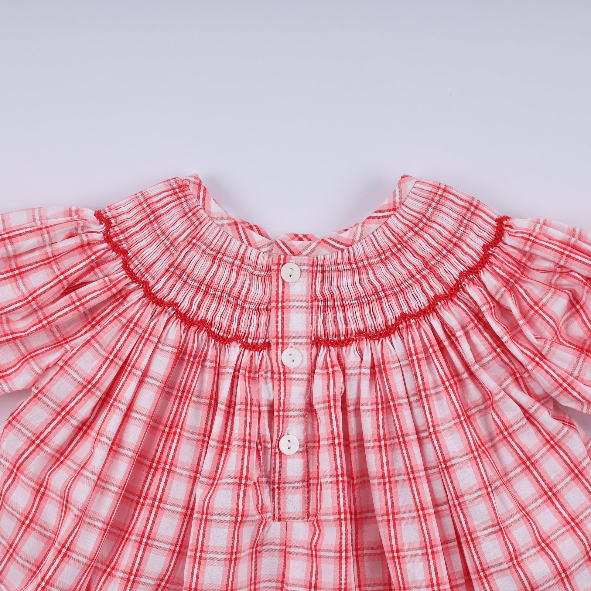 Dress your little one in holiday magic with this charming red plaid bloomer set featuring festive Santa Claus details. Hand-smocked craftsmanship adds texture and whimsy to the classic design, while the comfortable bloomer silhouette keeps kids moving freely through all their Christmas adventures. Perfect for holiday photos, family gatherings, or spreading seasonal cheer wherever they go. A delightful choice for parents who love timeless, playful holiday style.