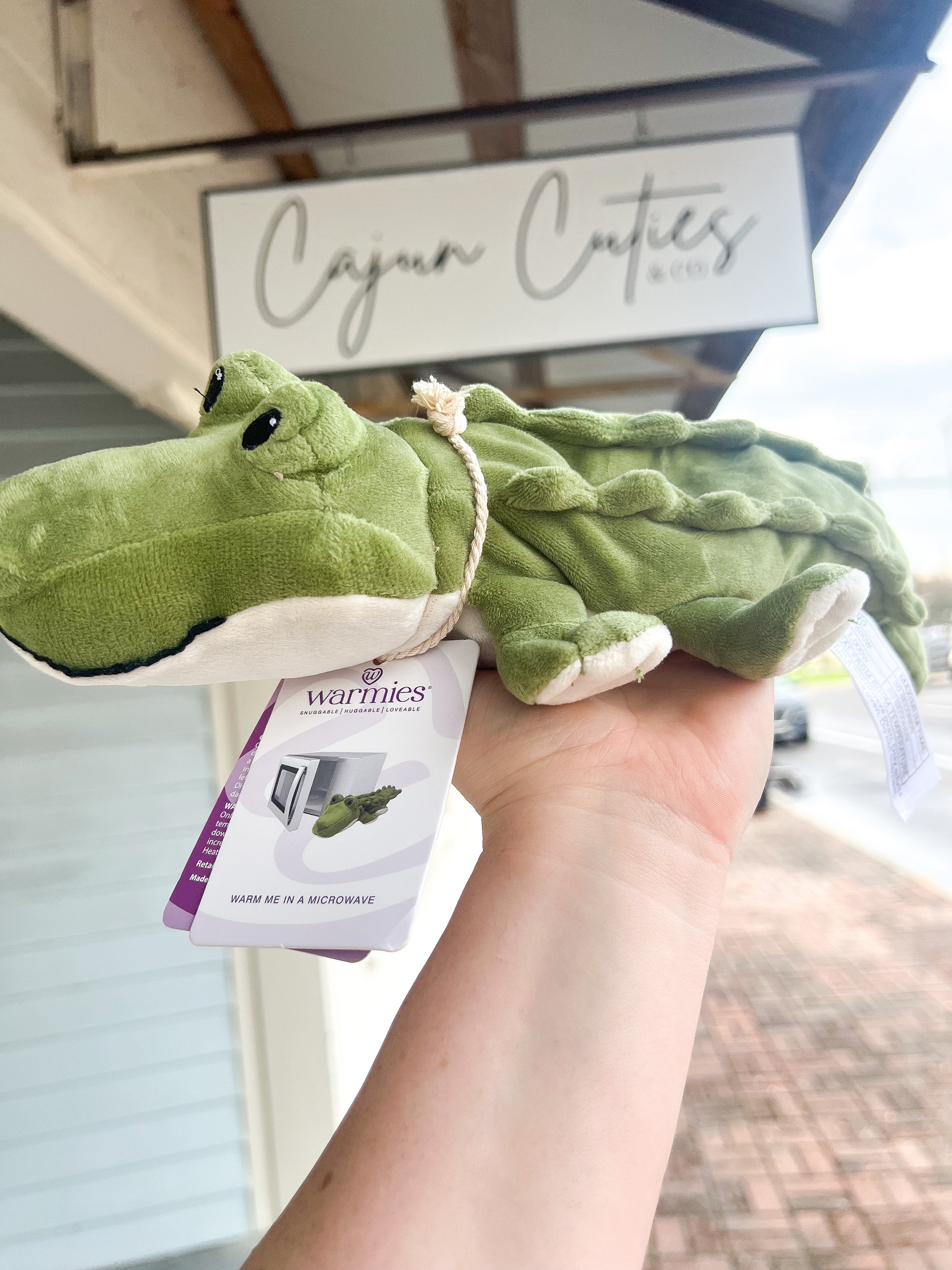 Soft plush alligator Warmie, microwavable and lavender-scented for soothing warmth and relaxation, perfect for cuddly comfort.