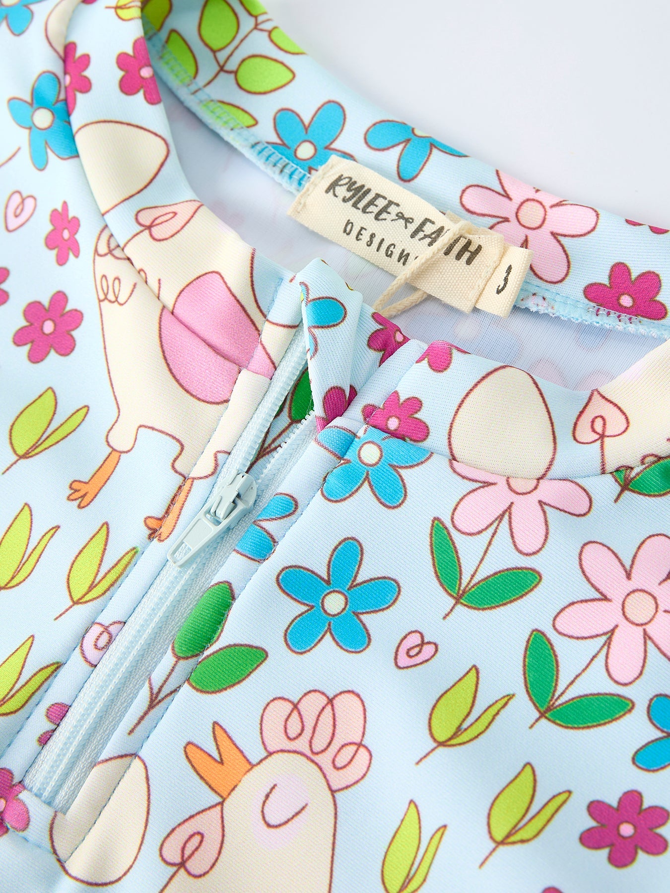 Summer Chicken Print Girls Long Sleeve Swim Set